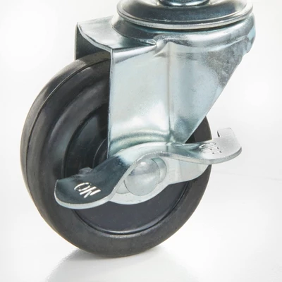 • Features two drawers, spice rack, two towel bars with locking caster wheels for safety